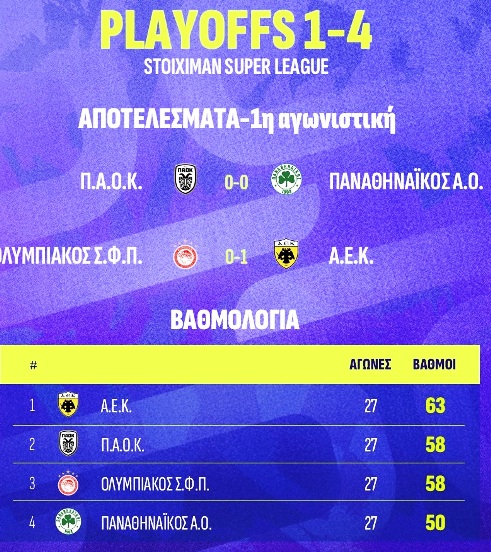 Ξεκάθαρο προβάδισμα για την κατάκτηση του τίτλου πήρε η ΑΕΚ καθώς μετά τη νίκη της με 1-0 επί του Ολυμπιακού στο «Γ. Καραϊσκάκης», στην πρεμιέρα των πλέι οφ 1-4 του πρωταθλήματος της Α’  Εθνικής, ξέφυγε με πέντε βαθμούς από τους «ερυθρόλευκους» αλλά και τον ΠΑΟΚ που έμεινε νωρίτερα στη «λευκή» ισοπαλία με τον Παναθηναϊκό στην Τούμπα.