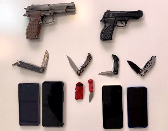 • -2- πιστόλια replica, -3- σουγιάδες και ένα αναδιπλούμενο μαχαίρι,