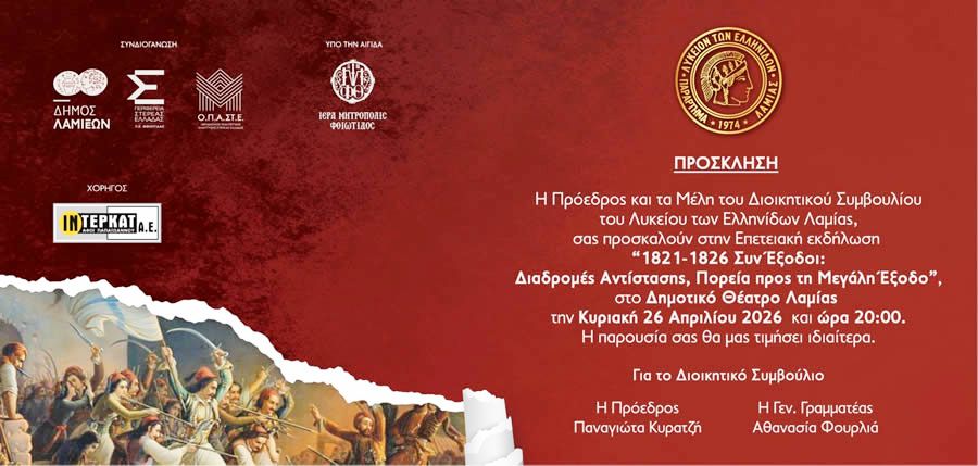 Το Λύκειον των Ελληνίδων Λαμίας προσκαλεί το κοινό στις 26 Απρίλη στο Δημοτικό Θέατρο Λαμίας, στις 20.00 να παρακολουθήσει μια παράσταση που τιμά την ιστορική μνήμη, αναδεικνύει την άυλη πολιτιστική κληρονομιά και μεταφέρει το διαχρονικό μήνυμα της Μεγάλης Εξόδου: ότι η ελευθερία είναι πράξη συλλογική, μνήμη ζωντανή και διαρκής διαδικασία συγκρότησης κοινού οράματος.