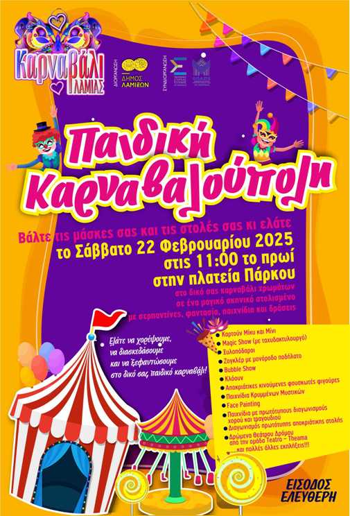 Οι Απόκριες έφτασαν και ο Δήμος Λαμιέων διοργανώνει για δεύτερη χρονιά μια μοναδική γιορτή αφιερωμένη στα παιδιά!