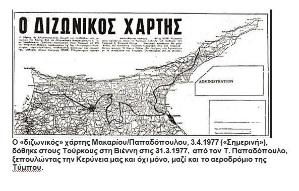 Δηλαδή, ο περιβόητος διζωνικός χάρτης που έδωσαν στους Τούρκους στη Βιέννη στις 31.3.1977, και που τούρκευε ολόκληρη την κατεχόμενη και όχι μόνο Κερύνεια, μαζί και το αεροδρόμιο της Τύμπου, ήταν καθαρά ένα βήμα προς τον επιδιωκόμενο εκτουρκισμό της Κύπρου…