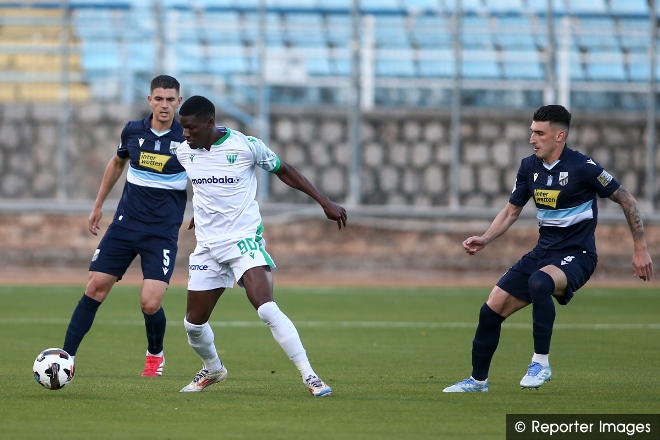 5′ Πρώτη προσπάθεια της Λαμίας σταματάει με τον Τσάπρα να βάζει το σώμα μπροστά από τον Τσιμπόλα και να αφήνει την μπάλα να περάσει άουτ