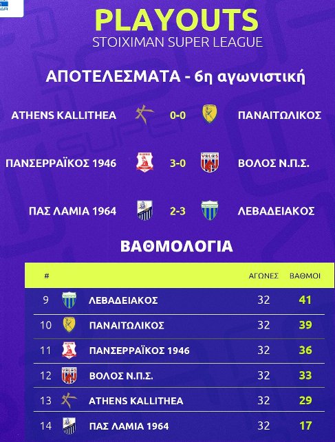 Στους 41 βαθμούς πλέον ο Λεβαδειακός, που θα φιλοξενήσει την επόμενη αγωνιστική την Καλλιθέα, ενώ η Λαμία, που περιμένει μαρτυρικά το φινάλε της διαδικασίας, για να πει αντίο στην Α’ Εθνική, φιλοξενεί τον Πανσερραϊκό.
