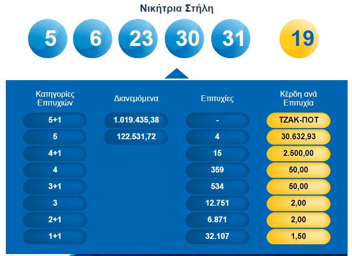 1,3 εκ. ευρώ τουλάχιστον θα μοιραστούν οι τυχεροί της 1ης κατηγορίας στην επόμενη κλήρωση της Κυριακής 24/9/2023 μετά το ΤΖΑΚ-ΠΟΤ που σημειώθηκε κατά την αποψινή διαλογή της κλήρωσης του ΤΖΟΚΕΡ.