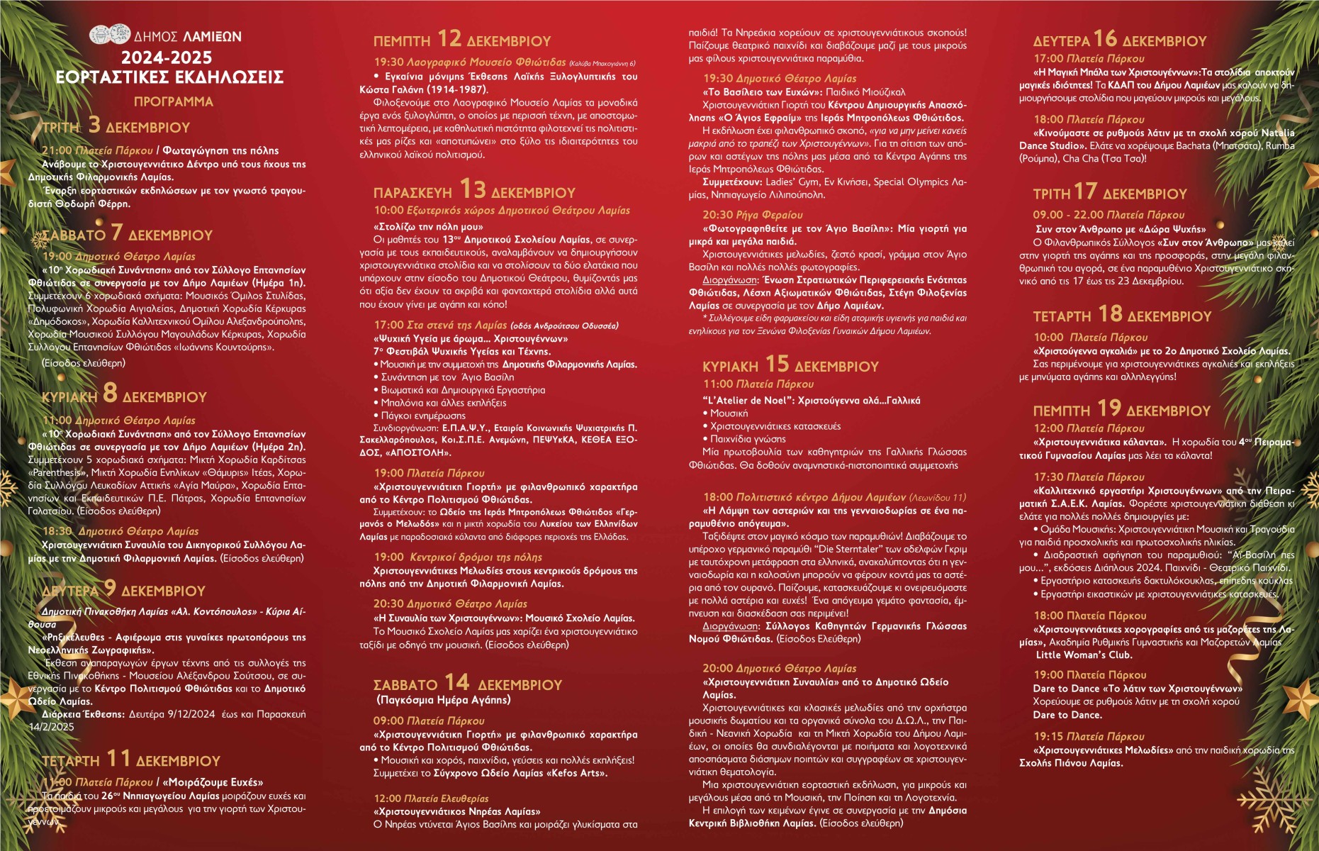 Χριστουγεννιάτικες και κλασικές μελωδίες από την ορχήστρα μουσικής δωματίου και τα οργανικά σύνολα του Δ.Ω.Λ., την Παιδική – Νεανική Χορωδία και τη Μικτή Χορωδία του Δήμου Λαμιέων, οι οποίες θα συνδιαλέγονται με ποιήματα και λογοτεχνικά αποσπάσματα διάσημων ποιητών και συγγραφέων σε χριστουγεννιάτικη θεματολογία.